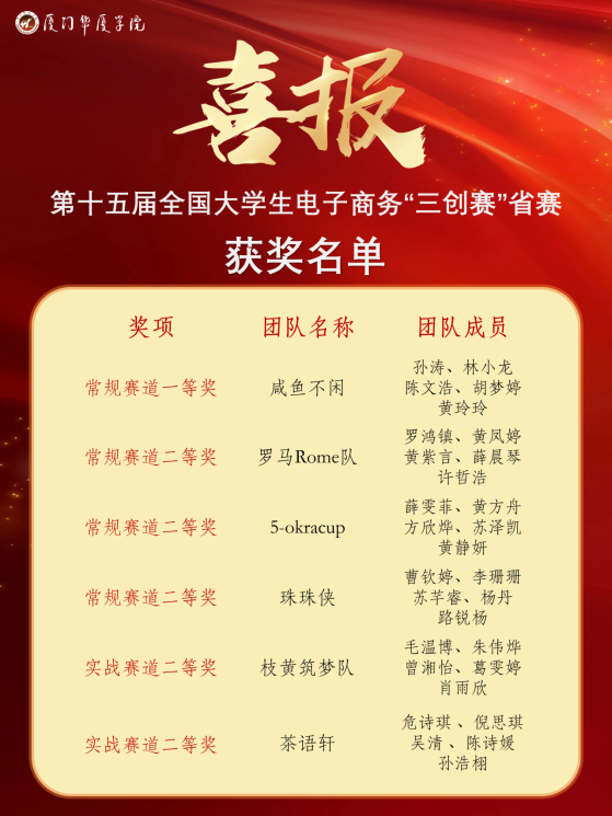 第十五届全国大学生电子商务“创新、创意及创业”挑战赛(简称“三创赛”)省级赛事圆满落幕。厦门华厦学院学子在比赛中表现亮眼,凭借优秀的项目创意与扎实的实践能力,在多个赛道斩获奖项。